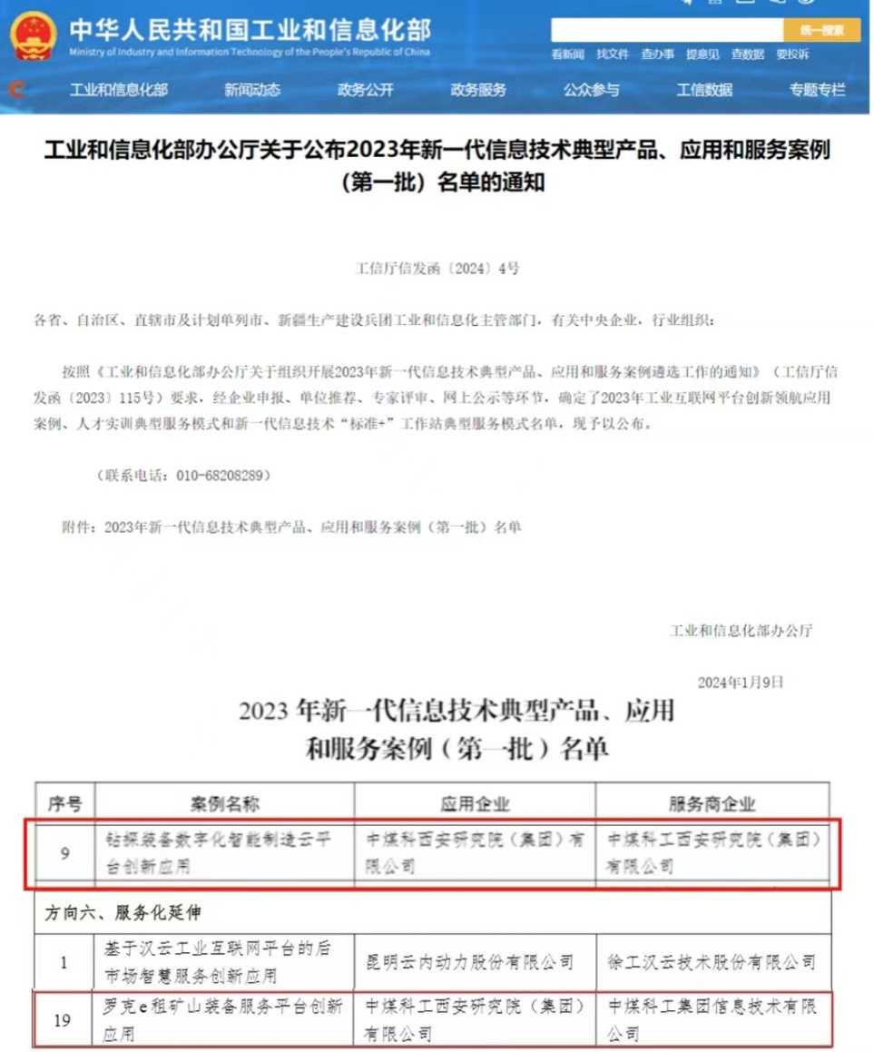 近日,从工信部传来消息,西安研究院报送的“钻探装备数字化智能制造云平台创新应用”及“罗克e租矿山装备服务平台”成功入选工信部2023年新一代信息技术典型产品、应用和服务案例。